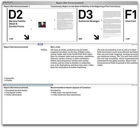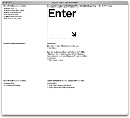 The website for the project curated by Binna Choi. Report (Not Announcement) consists of 39 contributions on the current ‘state of mobility’ by frequently travelling artists, writers and curators, themselves mostly made in transit. The main screen is divided horizontally, referring to the typically horizontal movements of people and objects in airports, train stations, and other transitory sites. Large sans-serif informational typography also points to the language of those places.